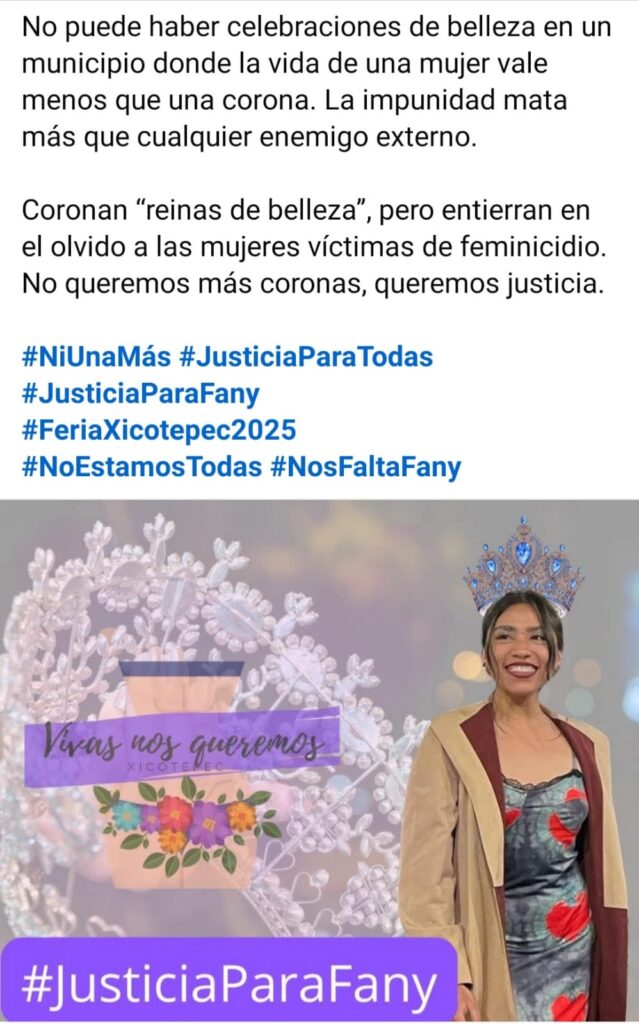 Vivas Nos Queremos Xicotepec también mencionó que alzar la voz por una víctima de feminicidio no opaca ningún reinado o certamen.