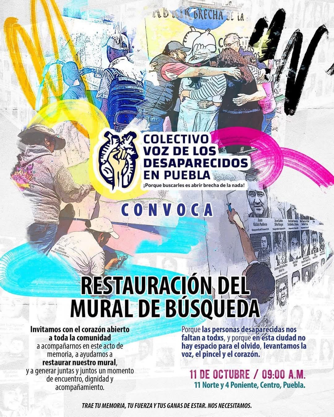 A un mes y cinco días de que fue borrado el Mural de búsqueda instalado en la fachada del Centro de Atención Múltiple (CAM) de la 4 Poniente y 11 Norte, el colectivo Voz de los Desaparecidos en Puebla ha convocado a la sociedad a que lo apoye en la restauración de dicho mural.