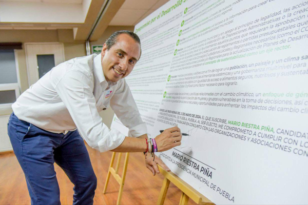 El candidato a la Presidencia Municipal de Puebla, por el PAN, PRI, PRD y PSI, Mario Riestra, firmó un compromiso por el Desarrollo Sustentable y la Acción Climática en colaboración con el ICLEI, Gobiernos Locales por la Sustentabilidad.