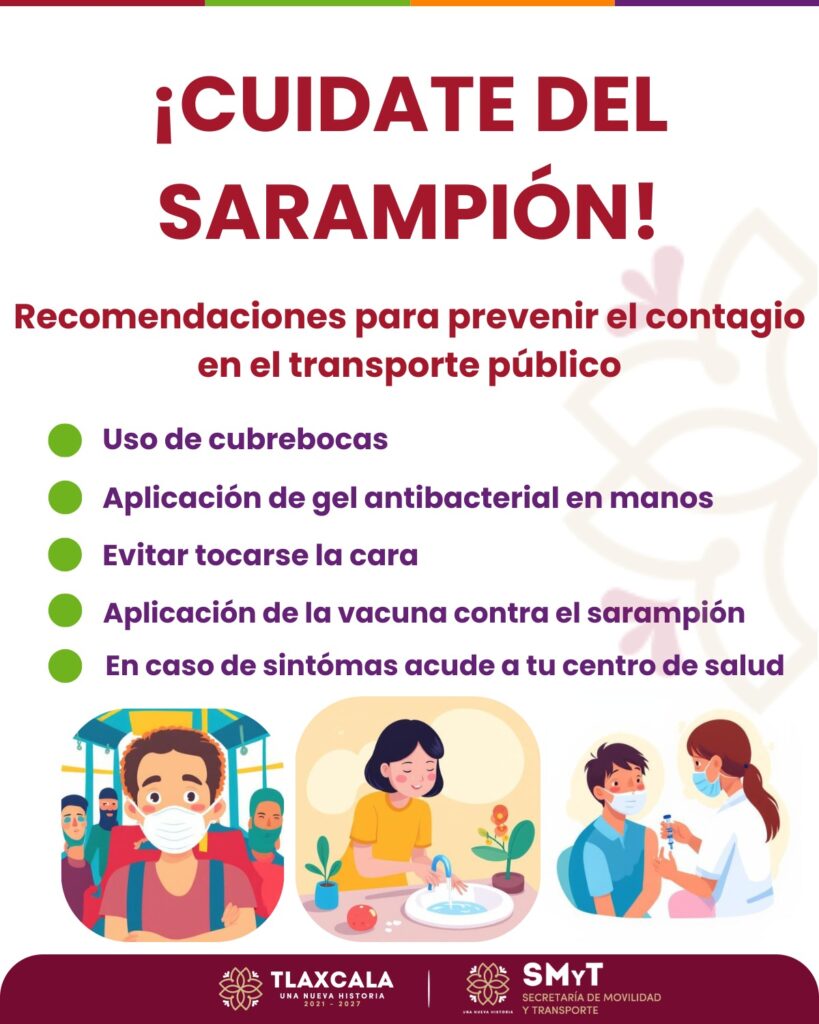 La Secretaría de Movilidad y Transporte (SMyT) de Tlaxcala exhorta a las personas concesionarias, operadoras y usuarias del servicio de transporte público en sus diferentes modalidades a fortalecer las acciones de prevención en materia de salud, ante el aumento de enfermedades respiratorias propias de la temporada, así como de sarampión.